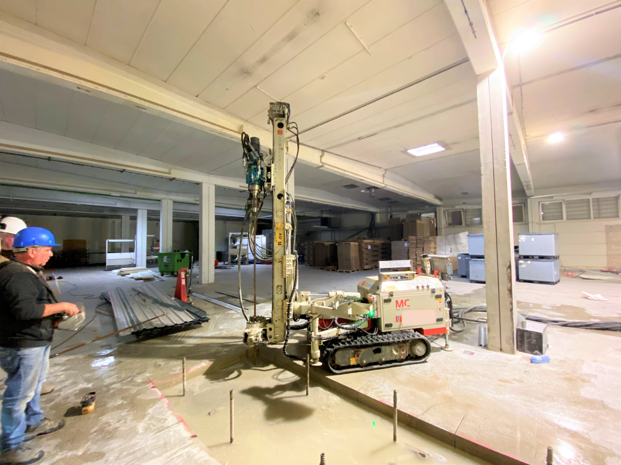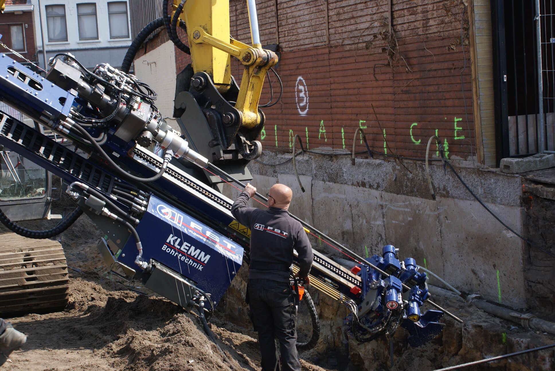 In opdracht van Diabeton werden er 8 micropalen geplaatst in een loods waar binnenkort een UV-robot geplaatst zal worden. Versteviging van de fundering was hier dus noodzakelijk, maar omdat de werkruimte niet bereikbaar is met onze andere machines, voerden wij deze opdracht uit met behulp van onze Commachio MC 3D. Deze machine is opgebouwd uit twee delen, waarvan het 'power pack' buiten blijft staan en dus niet voor storende uitlaatgassen in de bedrijfsruimte zorgt. De boorinstallatie kan door onze collega bediend worden met behulp van een afstandsbediening.